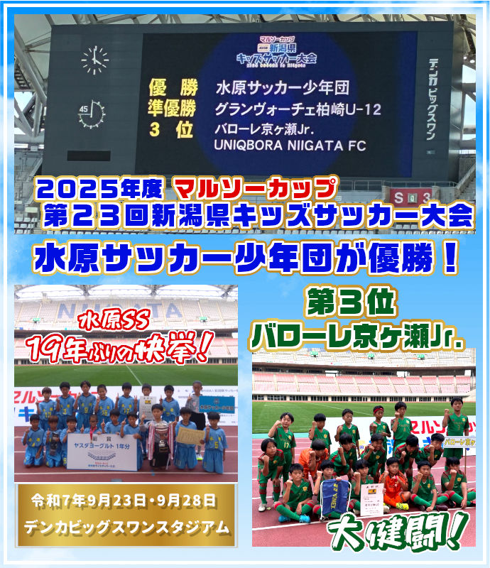 | 9月23日、28日に行われた(一社)新潟県サッカー協会主催『マルソーカップ第23回新潟県キッズサッカー大会』にて水原サッカー少年団が優勝を果たしました。 この大会は、小学4年生以下(U-10)を対象として開催され、県内の110チームが参加しています。水原サッカー少年団がこの大会で優勝するのは19年ぶり2度目の事です。 またこの大会ではバローレ京ヶ瀬ジュニアも大健闘。第3位に入賞したので、阿賀野市スポーツ少年団の2チームが揃って賞状を授与されました。 チームの皆様、おめでとうございます! |